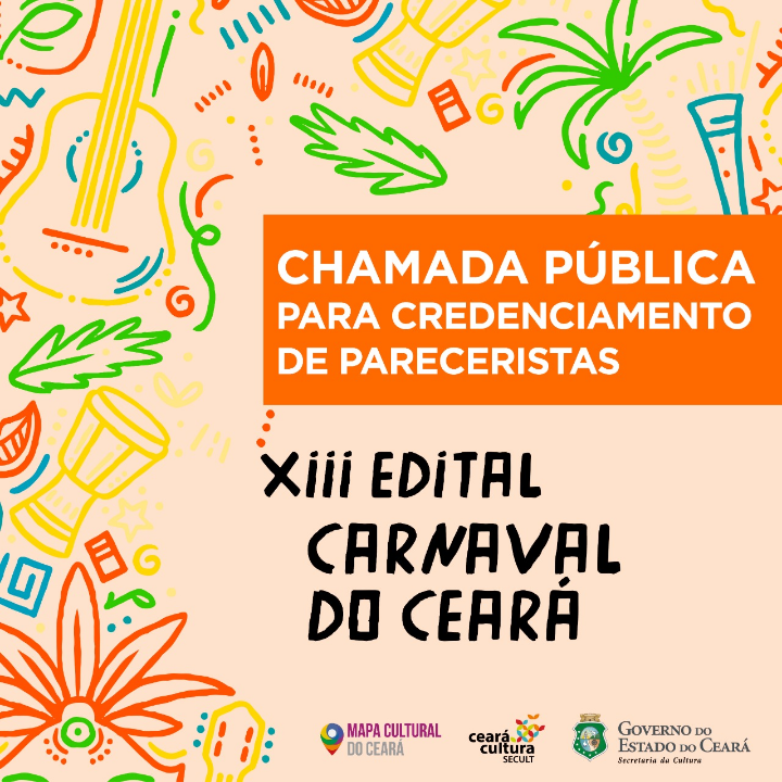 O Secretaria da Cultura do Estado do Ceará, com fundamento nas disposições da Lei nº 13.811/2006, regulamentada pelo Decreto Nº 28.442/2006 e pelo Decreto Nº 31.871/2015; bem como com fulcro no caput do art. 25 da Lei Nº 8.666/93, torna pública a convocação de pareceristas técnicos para avaliação de projetos culturais inscritos no XIII Edital Carnaval do Ceará 2019 . Este procedimento será regido por este Edital e, subsidiariamente, pela Lei Nº 8.666/93.