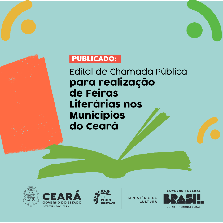 A Secult Ceará torna público o presente Edital de Chamada Pública para realização de Feiras Literárias nos Municípios do Ceará, para seleção de entidades sem fins lucrativos, qualificada pelo Estado do Ceará como ORGANIZAÇÕES DA SOCIEDADE CIVIL, comprovada de atuação no setor cultural e/ou expertise em atuação no campo do livro e leitura, organização e realização de programação literária, experiência em realização de eventos e feiras literárias, diálogo com a educação, o mercado livreiro, escritoras, escritores e os profissionais da cadeia mediadora do livro e organização e disponibilização de estrutura Feira de Livros com expositor (editoras, livrarias e autores independentes), contemplando praça de convivência, visando à seleção de organização da sociedade civil interessada em celebrar TERMO DE COLABORAÇÃO com a finalidade de realizar três Feiras Literárias nos Municípios do Ceará, com vistas à aplicação de recursos federais oriundos da Lei Complementar nº 195/2022 - Lei Paulo Gustavo, regulamentada pelo Decreto Federal nº 11.525, de 11 de maio de 2023, com fundamento na Lei Estadual nº 12.781, de 30 de dezembro de 1997 e suas alterações.