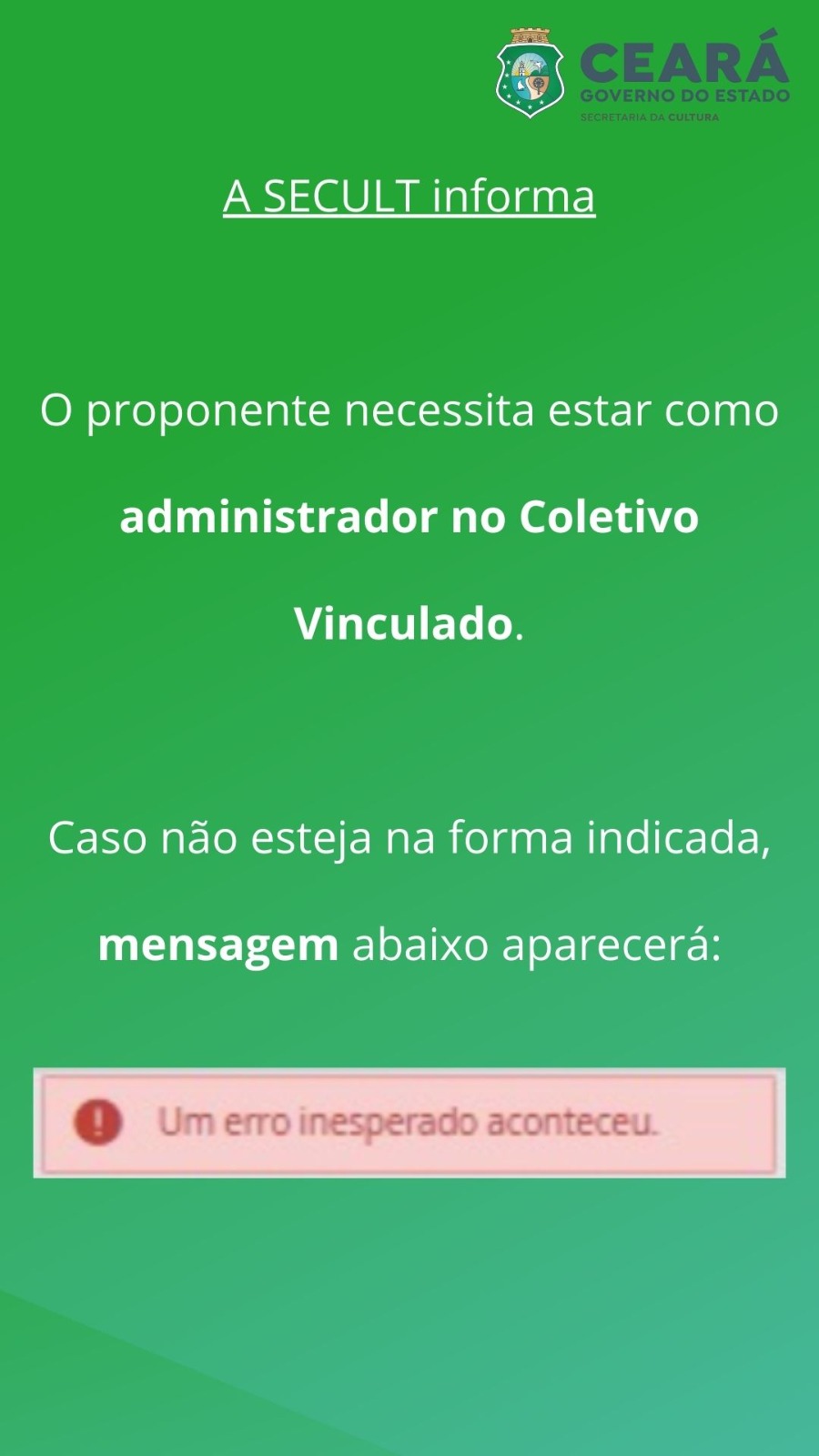 Motivo: Isso ocorre em razão do agente responsável pela inscrição, não estar como proprietário ou administrador do perfil do coletivo vinculado na ficha de inscrição.